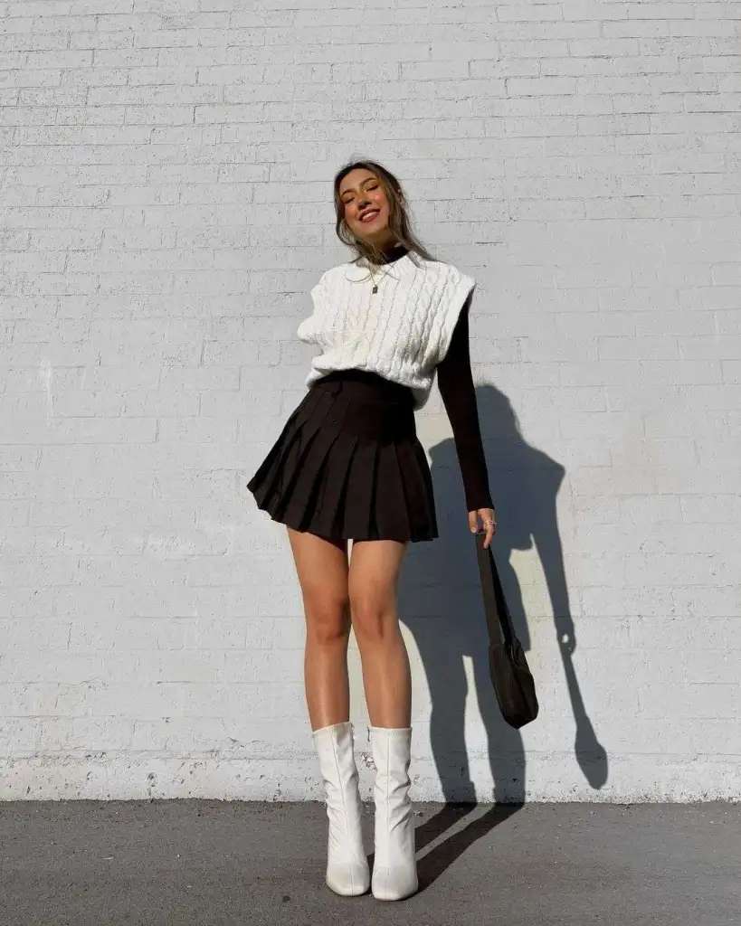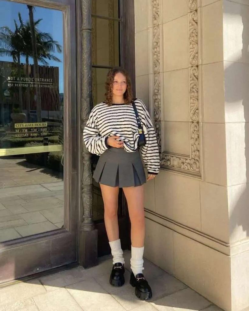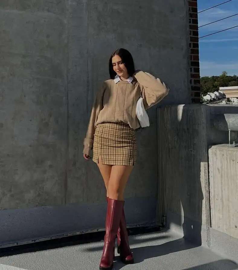 A pleated skirt paired with a cozy sweater is a go-to combination for preppy outfits. This look balances sophistication and comfort, making it perfect for casual outings or campus days. Finish with knee-high boots to add a polished touch while keeping it effortlessly chic.