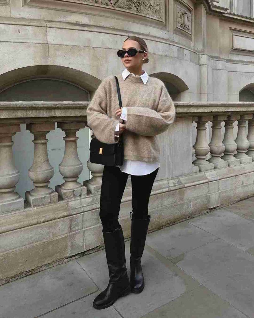 21. Oversized Shirt Under Sweater and Boots Outfit
