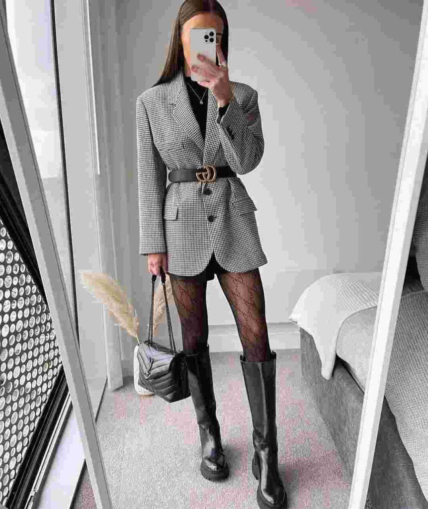 An oversized blazer instantly elevates preppy outfits, creating a structured yet relaxed aesthetic. Wear it over a fitted dress or a pleated skirt for a refined look. Knee-high boots add a bold, stylish element, making this outfit perfect for a modern, polished vibe.