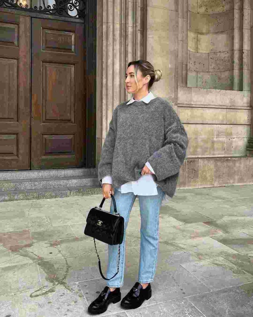 An oversized sweater styled with jeans is a cozy take on preppy outfits, blending casual and polished elements. Tuck the sweater slightly for a more structured look, and complete the outfit with loafers for a sophisticated yet effortless touch.