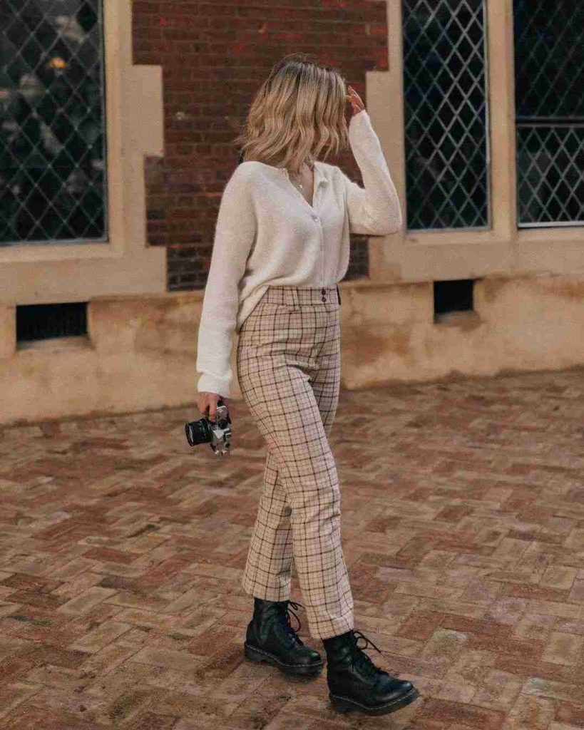 A soft cardigan layered over a fitted top with plaid pants creates a timeless preppy outfit. This look is perfect for a casual yet refined aesthetic, making it great for brunch dates or stylish everyday wear. Complete it with loafers or ballet flats for extra elegance.