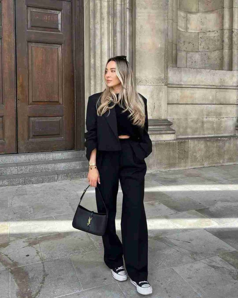 An all-black outfit brings a chic, modern take on preppy outfits. A cropped sweater with tailored pants creates a sleek silhouette, perfect for both casual and dressy occasions. Elevate the look with polished loafers or ankle boots.