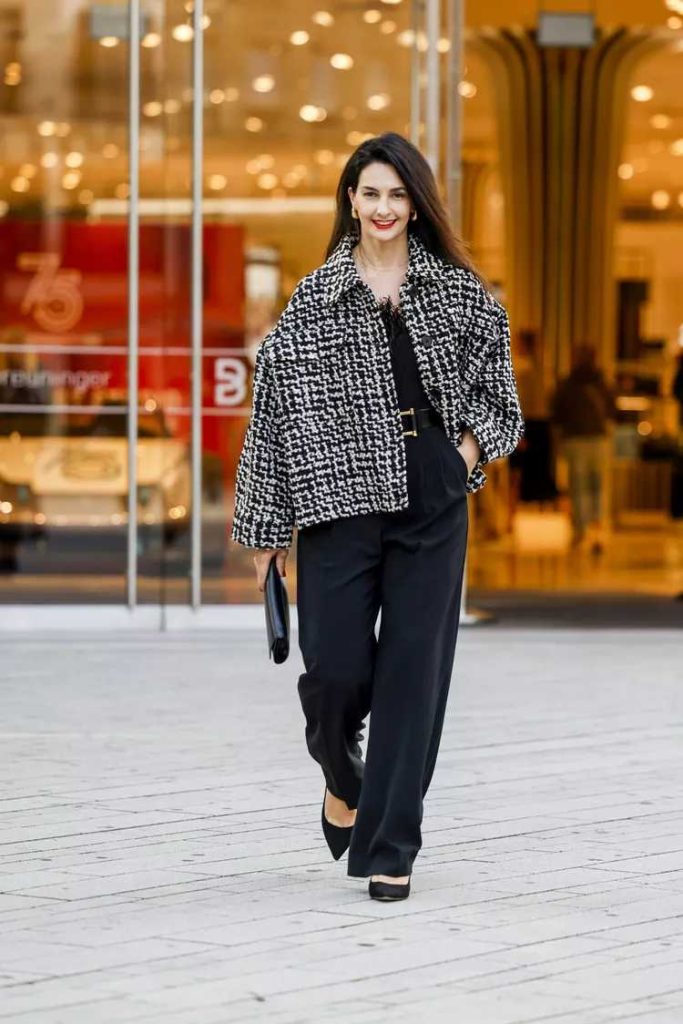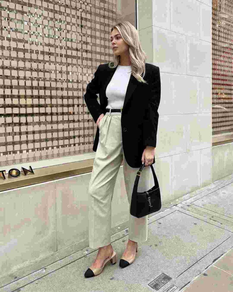 When dressing up for work or a more formal wide-leg outfit, structured wide-leg trousers with a tailored blazer create an effortlessly chic ensemble. Neutral tones like beige, black, and navy add a refined touch, while a sleek blouse or fitted knit top keeps the look polished. Complete the outfit with pointed-toe heels and a structured handbag for a professional yet fashionable appearance. This combination works especially well for office settings or important meetings, proving that wide-leg pants can be both comfortable and stylish.