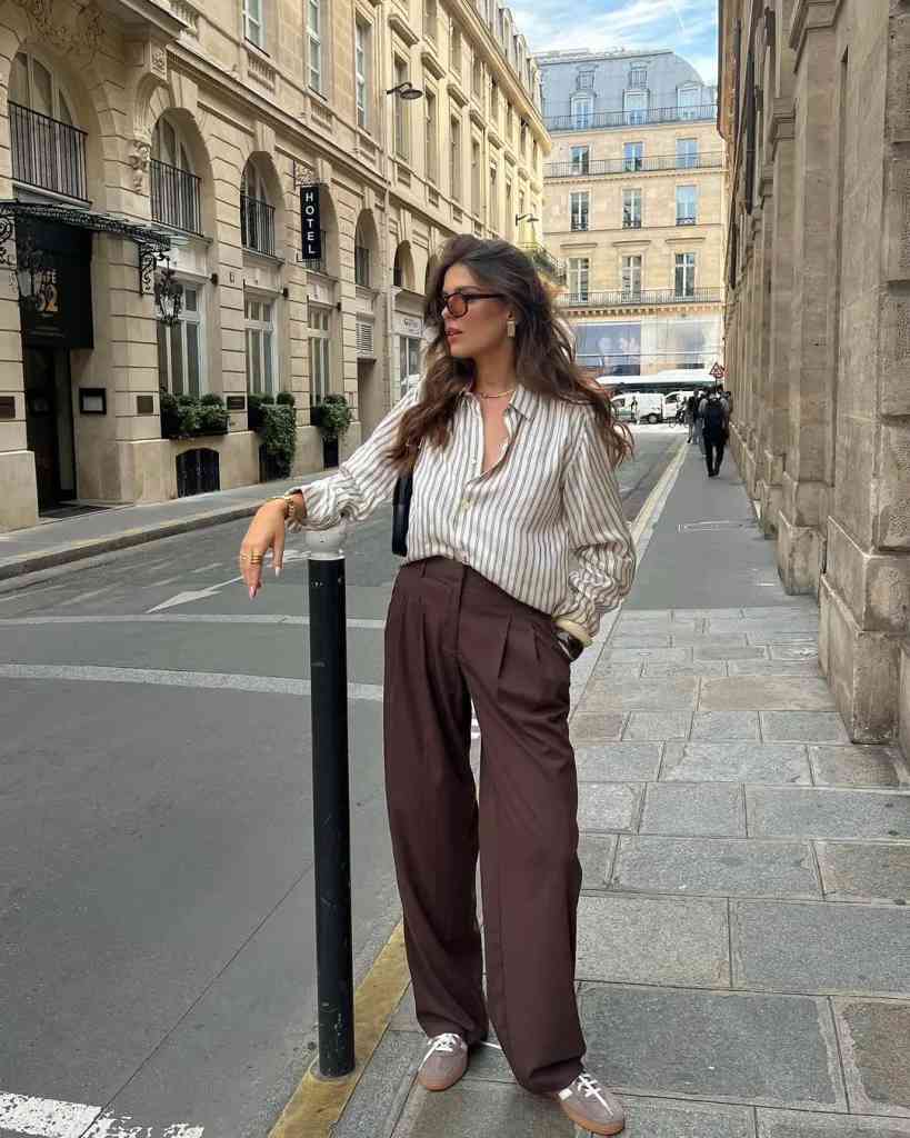 Stripes effortlessly elevate Wide Leg Outfit Ideas, especially when paired with rich brown trousers. This combination blends classic charm with modern sophistication, making it perfect for both casual and office settings. Complete the look with neutral heels or loafers for a polished and stylish finish.