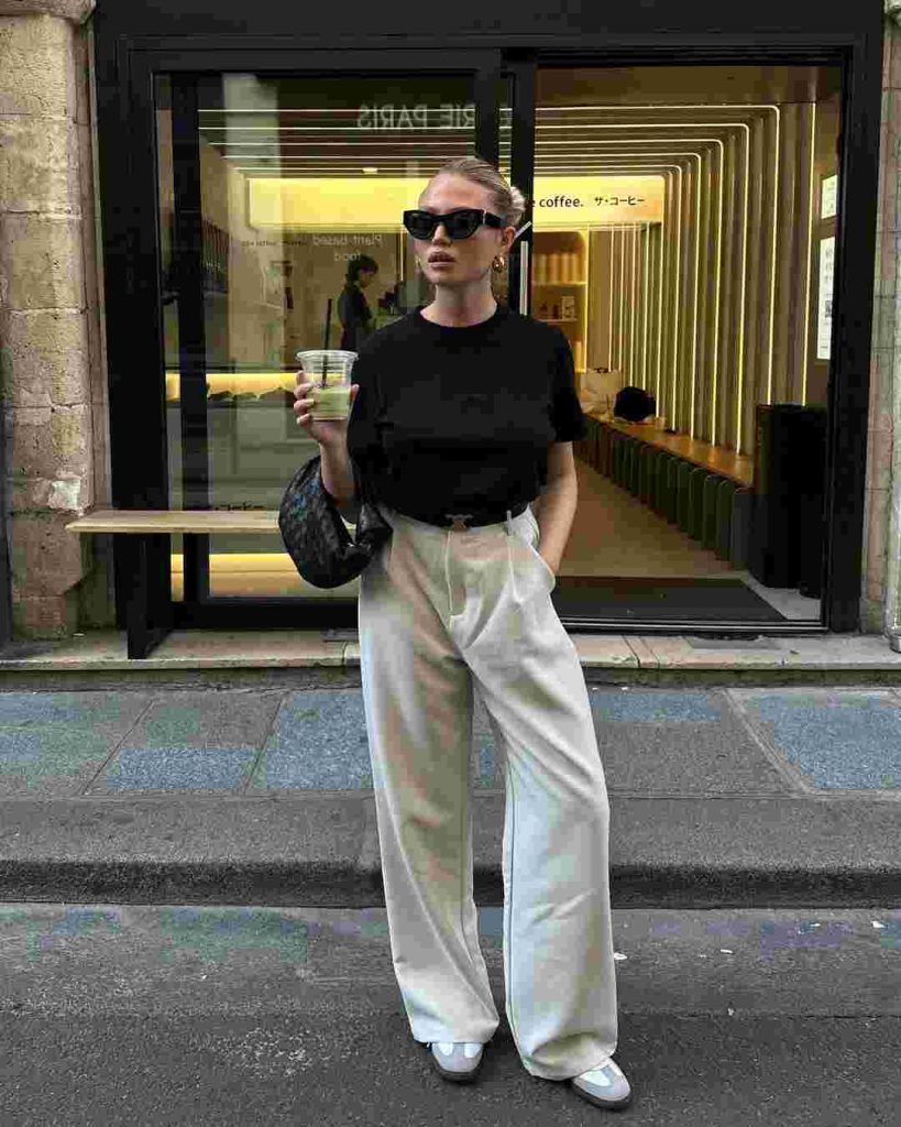 For a laid-back yet stylish take on Wide Leg Outfit Ideas, a casual black tee with relaxed beige wide-leg trousers is a go-to combination. This effortless outfit is perfect for everyday wear, best paired with sneakers or flat sandals for comfort and style.