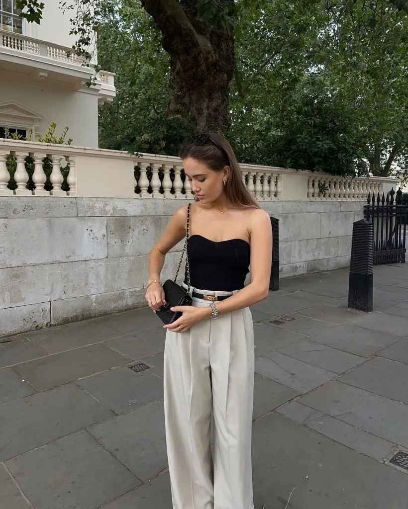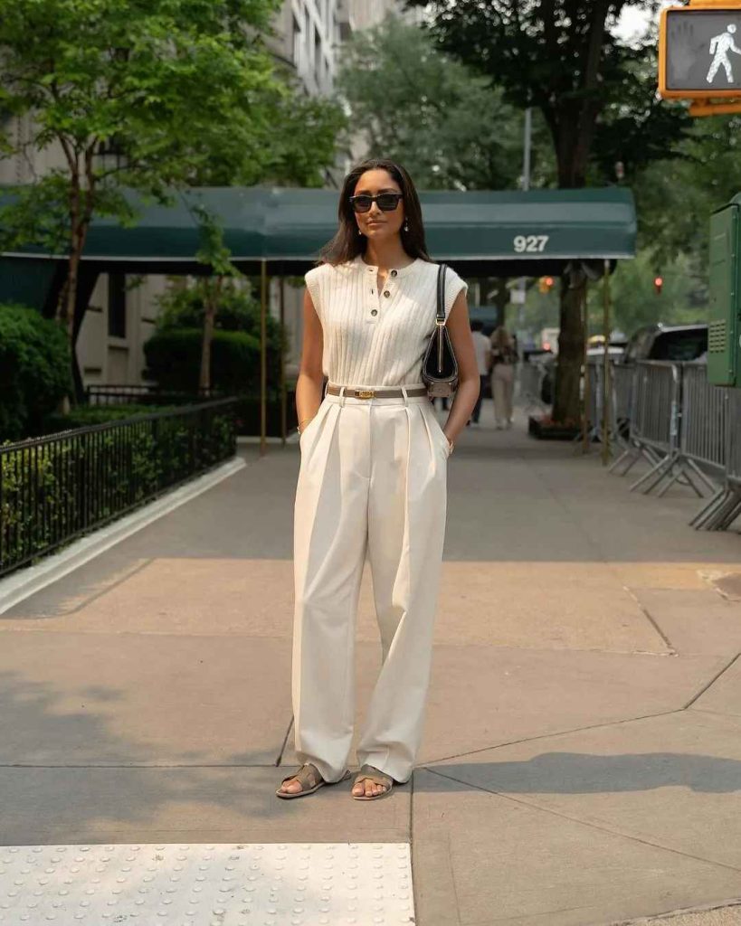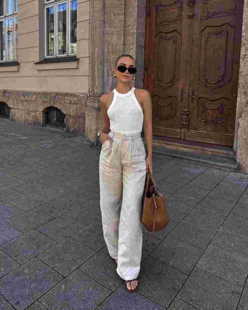 A sleek white tank top tucked into high-waisted wide-leg trousers is one of the most effortlessly chic Wide Leg Outfit Ideas. This minimal yet sophisticated look works for various occasions, from casual outings to semi-formal settings. Add a structured bag and delicate jewelry to complete the outfit.