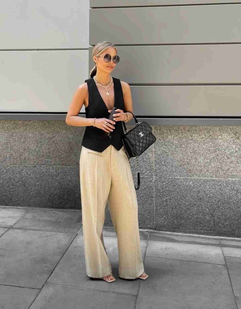 A tailored vest with relaxed wide-leg trousers blends structure and ease in Wide Leg Outfit Ideas. This look is perfect for those who love menswear-inspired fashion with a feminine touch. Wear it with loafers or pointed heels for a refined and contemporary outfit.