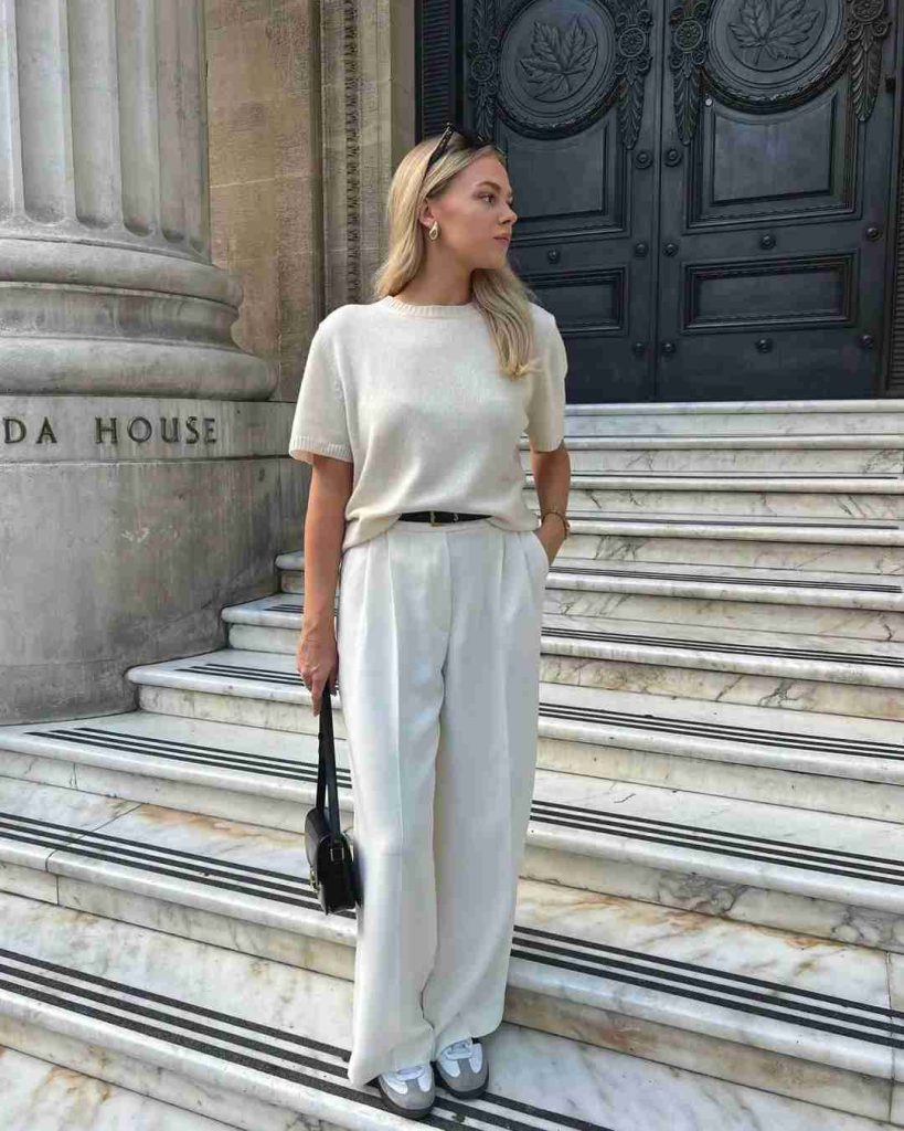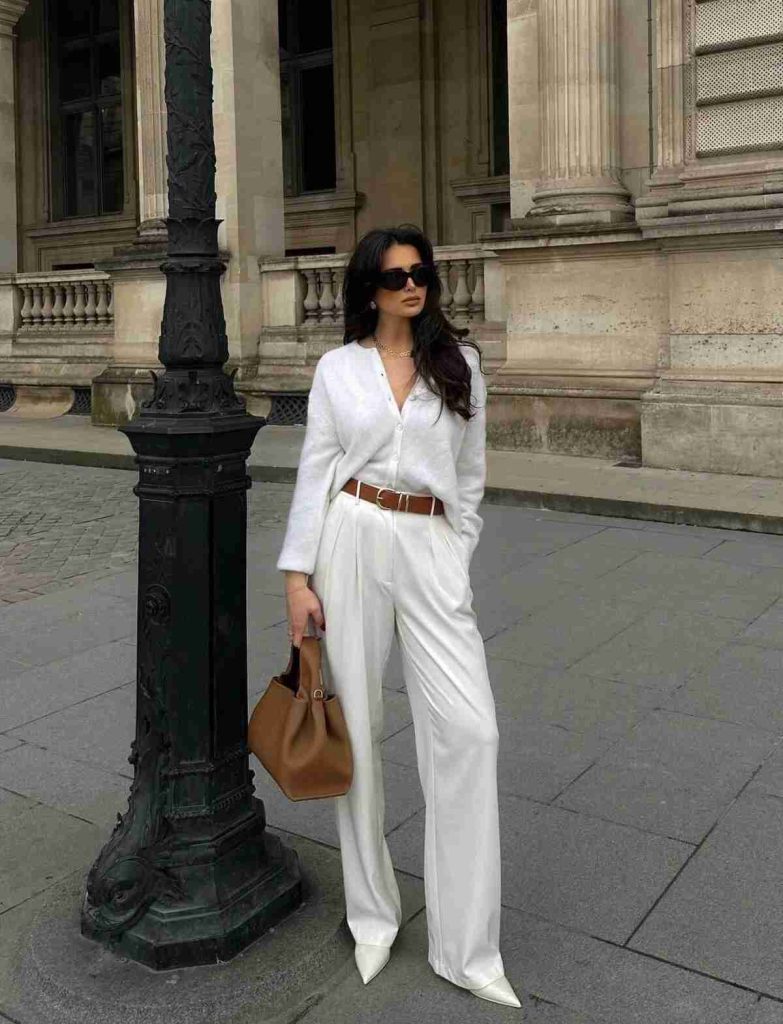 An all-white outfit featuring wide-leg pants is a fresh and elegant take on Wide Leg Outfit Ideas. The monochrome palette creates a clean, sophisticated aesthetic, perfect for formal or semi-casual settings. Add gold accessories and nude heels to enhance the polished look.
