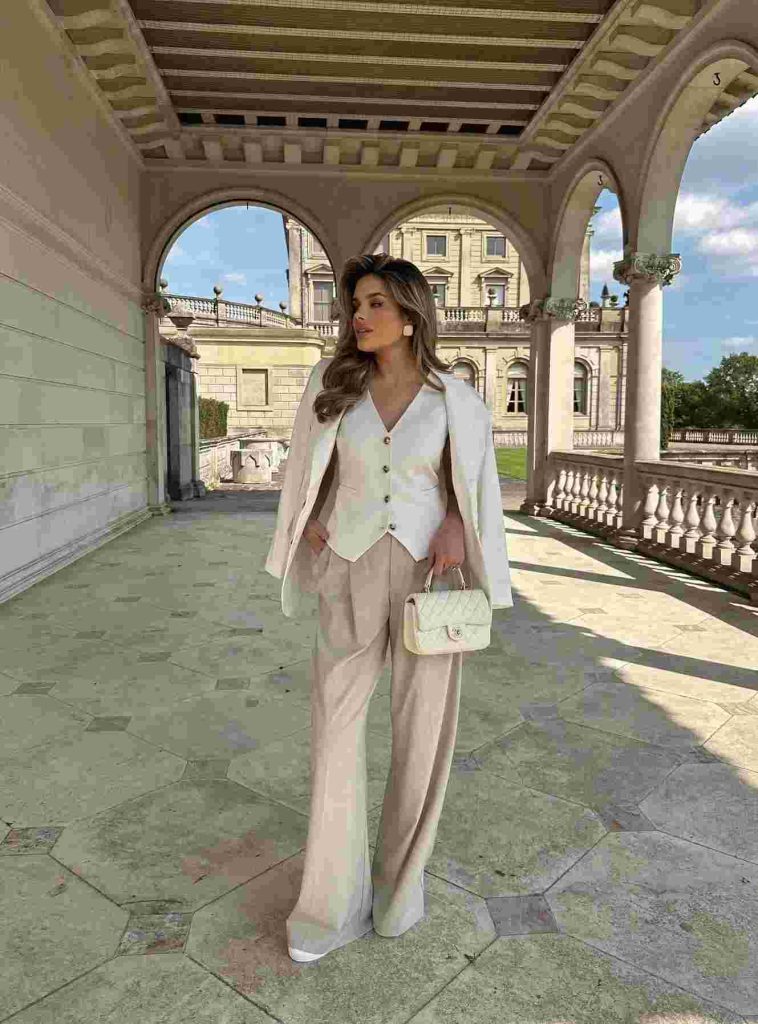 A white power suit with wide-leg trousers is one of the most striking Wide Leg Outfit Ideas for a bold and sophisticated statement. This outfit is perfect for business meetings or elegant events. Complete the look with pointed heels and a sleek handbag for a powerful finish.