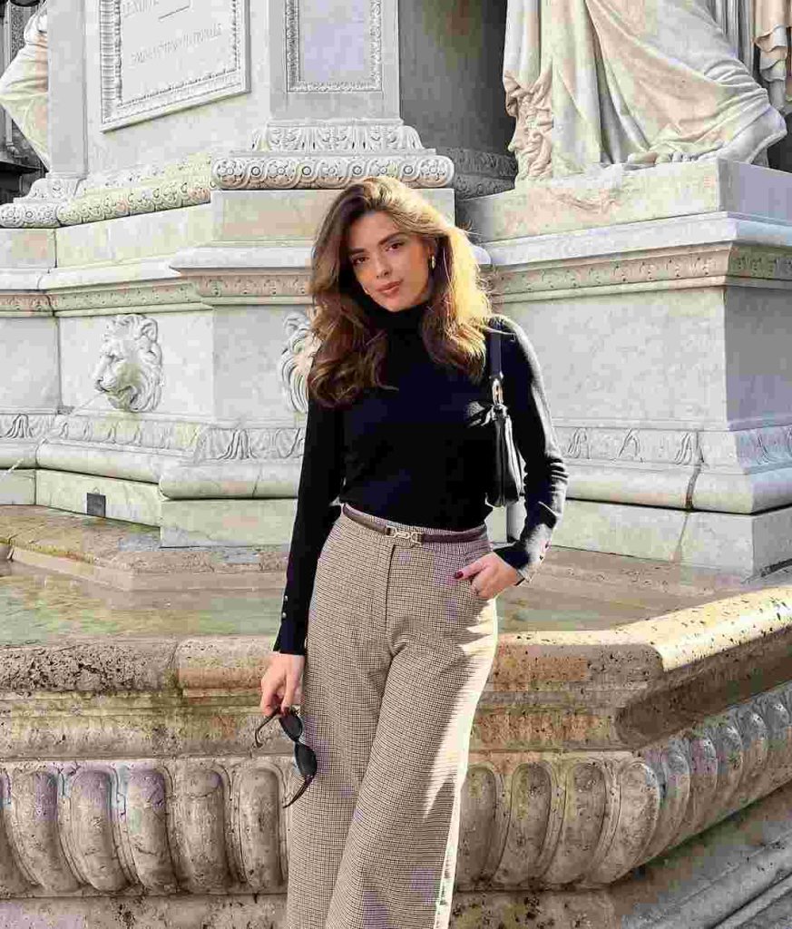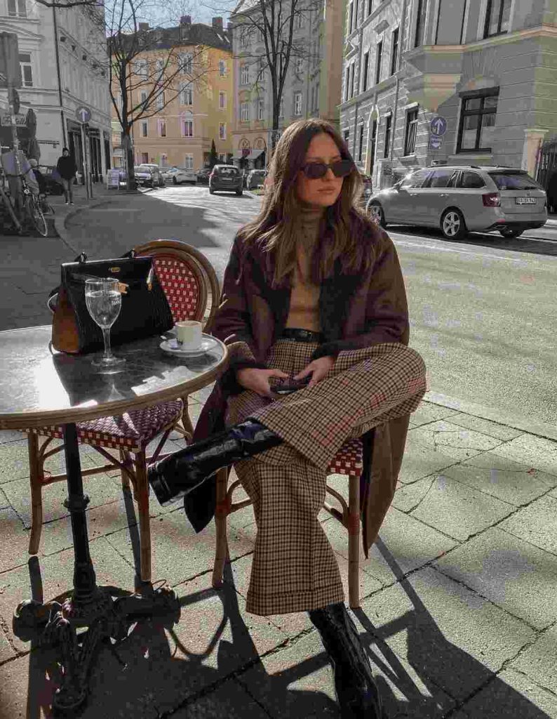 Plaid wide-leg pants styled with cozy warm layers make timeless Wide Leg Outfit Ideas. This outfit is ideal for chilly days, offering both style and comfort. Pair it with a fitted sweater and structured coat for a chic, winter-ready look.