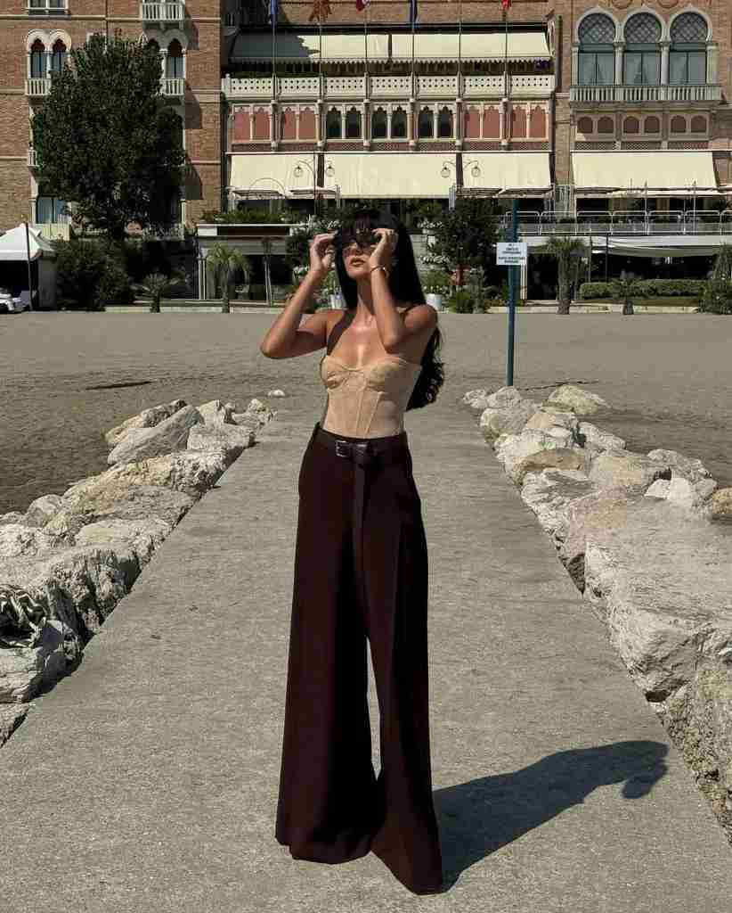 For a bold yet elegant look, Wide Leg Outfit Ideas featuring a corset top and maroon flared pants create a stunning silhouette. This pairing accentuates the waist while adding a touch of glamour. Style it with pointed-toe heels and delicate accessories for a chic evening ensemble.