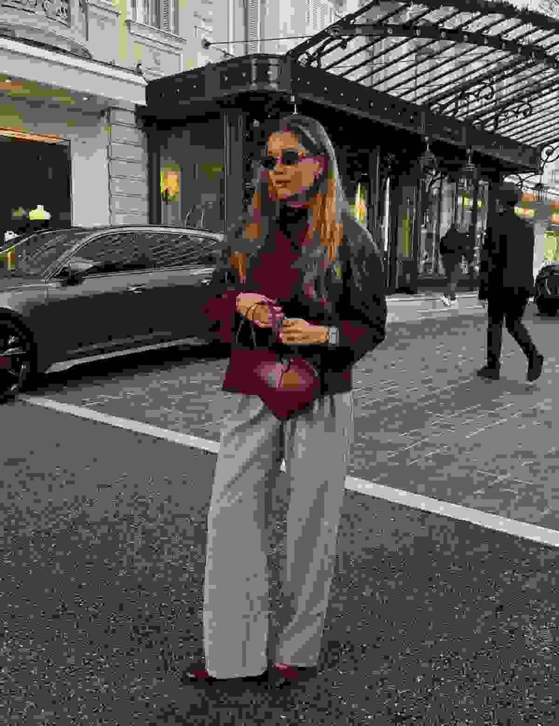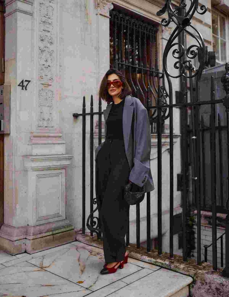 A sleek grey blazer over a black outfit featuring wide-leg trousers is a modern take on Wide Leg Outfit Ideas. This minimalist combination exudes confidence and sophistication, making it great for both work and evening outings. Style it with pointed heels and a structured clutch for a polished finish.