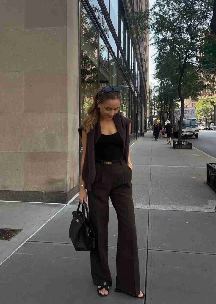 A monochrome-inspired brown and black combination is a timeless approach to Wide Leg Outfit Ideas. Layering a sweater over a black top and wide-leg pants creates a structured yet cozy look. Finish it off with sleek boots or loafers for a refined yet relaxed ensemble.