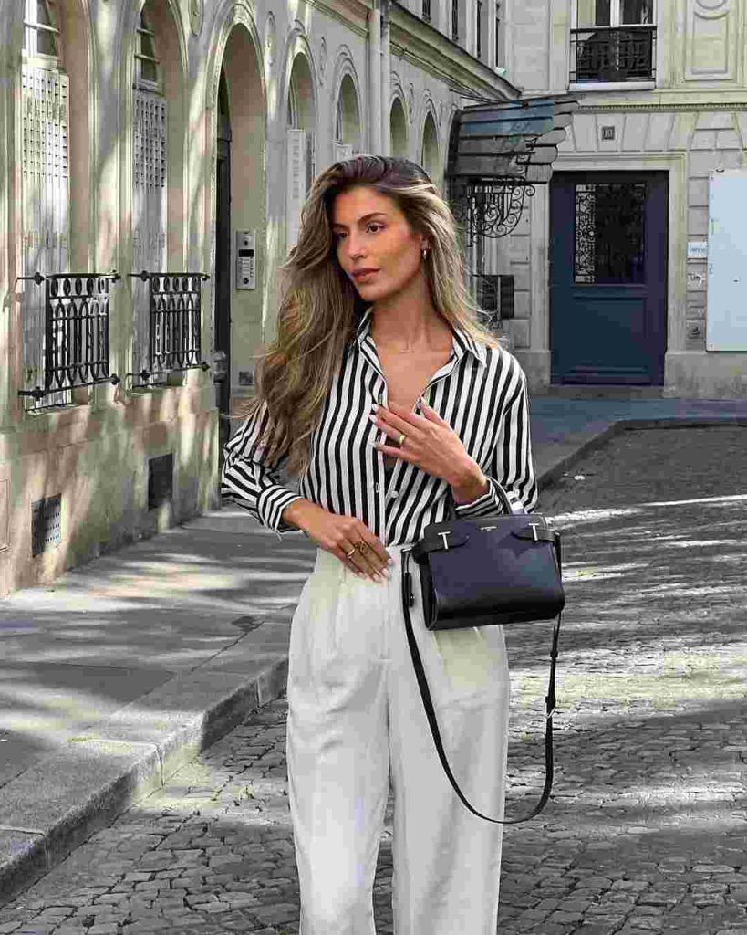 Crisp white pieces paired with striped accents make for classic Wide Leg Outfit Ideas. This combination is perfect for a fresh and polished look, whether for brunch or a day in the city. Style it with gold accessories and block heels for a sophisticated touch.