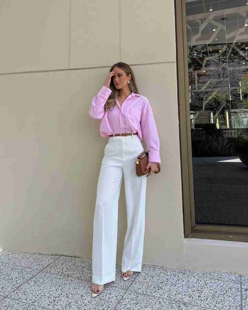 Adding a vibrant pink element to fresh white wide-leg pants makes Wide Leg Outfit Ideas feel lively and trendy. This color combination is perfect for spring and summer, bringing brightness to any outfit. Finish with nude heels or sandals for a balanced and chic look.
